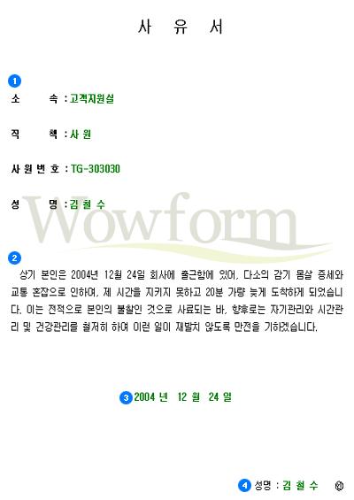 »çÀ¯¼­´Â ¾î¶°ÇÑ ÇàÀ§·Î ÀÎÇØ ÀϾ ÀÏÀ» ±â·Ï/º¸°íÇÏ´Â ¹®¼­¸¦ ¸»Çϴµ¥ °³ÀÎÀÇ ÇÇÄ¡¸øÇÒ »çÁ¤À¸·Î ÀÎÇØ ¹Ì¸® °èȹµÈ Çà»ç/¾à¼Ó/°è¾à ±âŸµîµîÀ» ¼öÇàÇÏÁö ¸øÇÏ¿´´ø ÀÌÀ¯¸¦ ¼³¸íÇÏ´Â °ÍÀ¸·Î À°ÇÏ¿øÄ¢¿¡ ÀÇÇÏ¿© ÀÛ¼ºÇϵÇ.º»ÀÎÀÌ ÁÖÀåÇÏ°í ½ÍÀº ³»¿ëÀ» »ó¼¼È÷ ±â¼úÇÏ¿© ´ã´çÀÚ¿¡°Ô º¸°íÇÏ´Â ¹®¼­¸¦ ¸»ÇÑ´Ù. °¡´ÉÇϸé Áõ°Å°¡ µÉ¸¸ÇÑ °Íµµ ÷ºÎÇÏ¸é ½Å·Úµµ°¡ °¥ °ÍÀÌ´Ù.