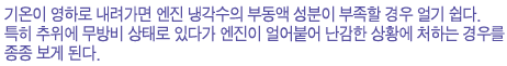 º¸Åë ³Ã°¢¼ö°¡ ¾ó¸é ¶óµð¿¡ÀÌÅ͵µ °°ÀÌ ¾î´Â ¼ö°¡ ¸¹´Ù. µû¶ó¼ ³Ã°¢¼ö¸¦ Á¡°ËÇÏÁö ¸øÇÑ »óÅ¿¡¼ ±â¿ÂÀÌ ¿µÇÏ·Î ¶³¾îÁ³´Ù¸é °ð ¹Ù·Î ½Ãµ¿À» °ÉÁö ¸»°í ³Ã°¢¼ö ĸÀ» ¿¾îº¸°Å³ª °¢Á¾ È£½º·ù¸¦ ¸¸Áö¸é¼ ¾óÀ½ÀÌ ¾ó¾îÀÖ´ÂÁö ¿©ºÎ¸¦ ÆÇ´ÜÇÑ ÈÄ ½Ãµ¿À» °Å´Â °Ô ÁÁ´Ù. ¸¸¾à ¾óÀ½ÀÌ º¸ÀÌ¸é ½Ãµ¿À» °ÉÁö ¸»°í Àü¹®°¡ÀÇ µµ¿òÀ» ¹Þ¾Æ¾ß ÇÑ´Ù. ±×·¯³ª »óȲÀÌ ¿©ÀÇÄ¡ ¸øÇÑ °æ¿ì¿£ µû¶æÇÑ ¹°À» ¿£Áø °ü·Ã ±â°ü µî¿¡ ºÎ¾î ¾óÀ½À» ³ìÀ̰ųª ½ºÆÀ ¼¼Â÷°¡ °¡´ÉÇÑ ¼¼Â÷ÀåÀ¸·Î °ßÀÎ, ¿£ÁøÀ» ³ìÀÎ ÈÄ ½Ãµ¿À» °É¾î¾ß 2Â÷ °íÀåÀ» ¸·À» ¼ö ÀÖ´Ù.
